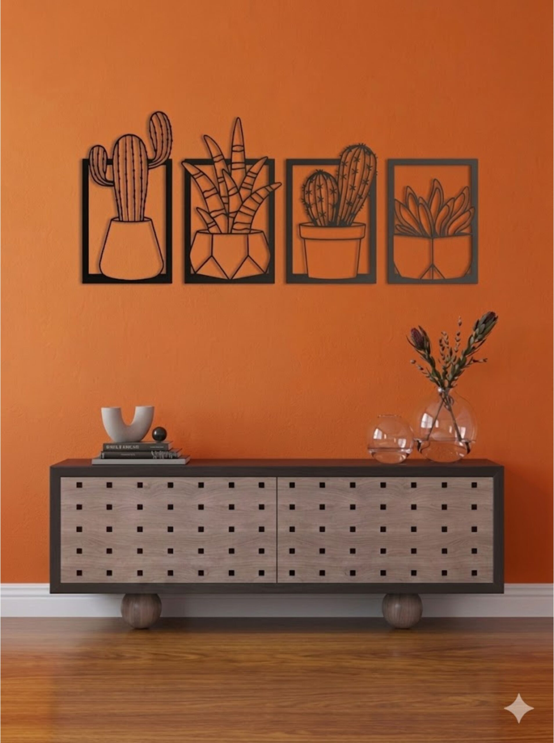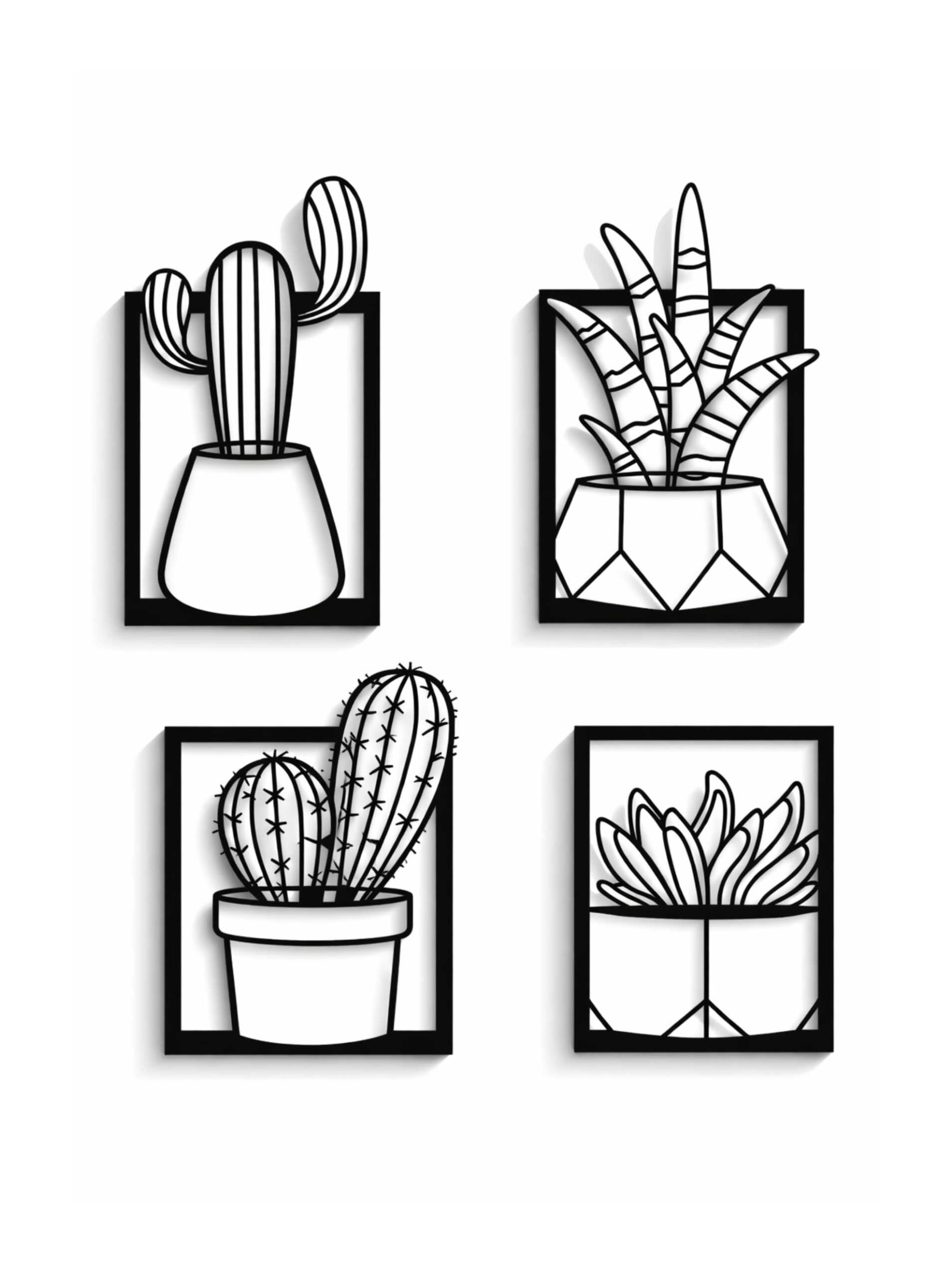 Each panel showcases a unique cactus or succulent design, framed within a clean geometric border, offering a perfect balance of structure and organic beauty. Display all four panels together for a bold statement wall or arrange them separately to create a customized artistic layout.