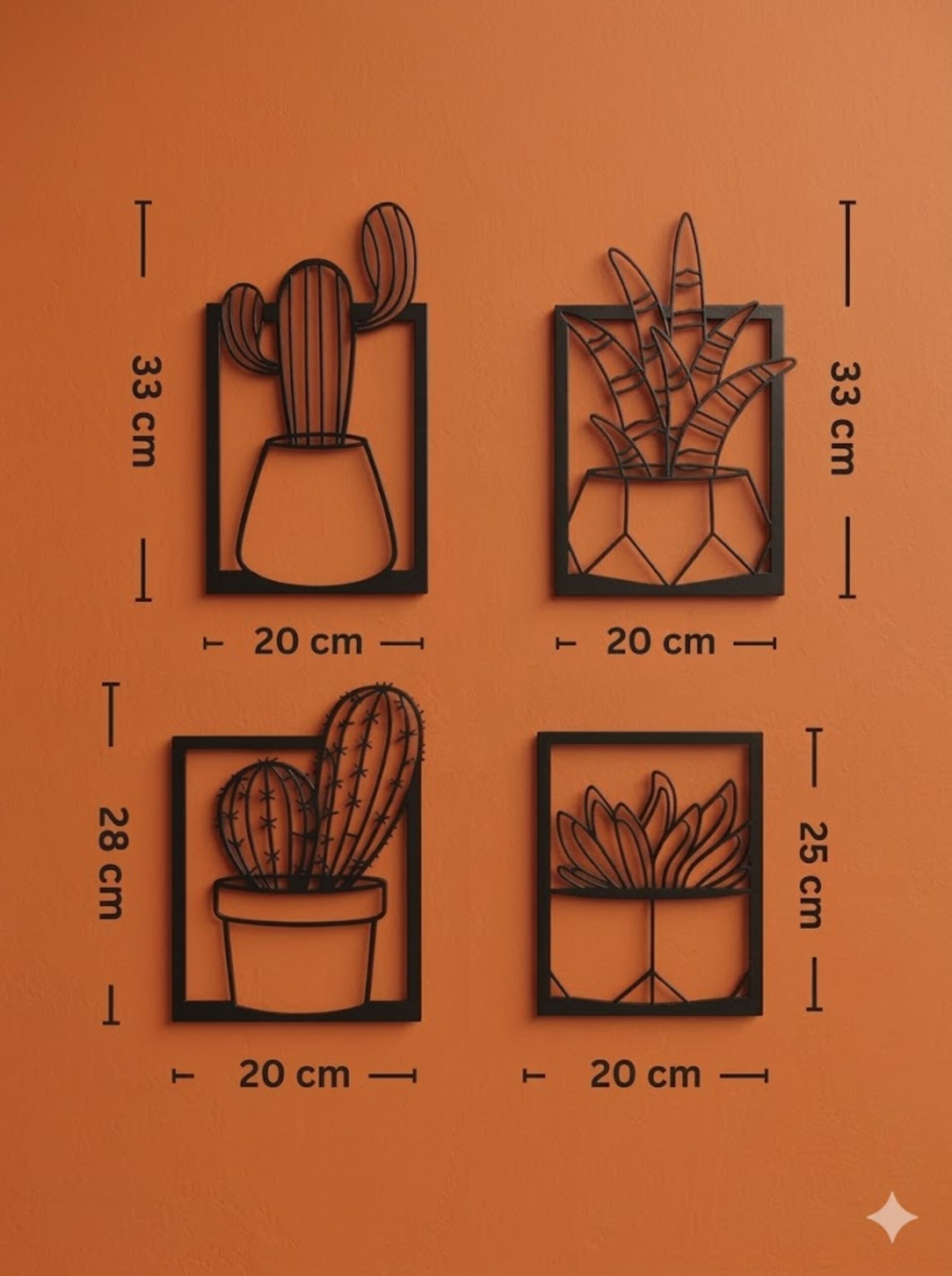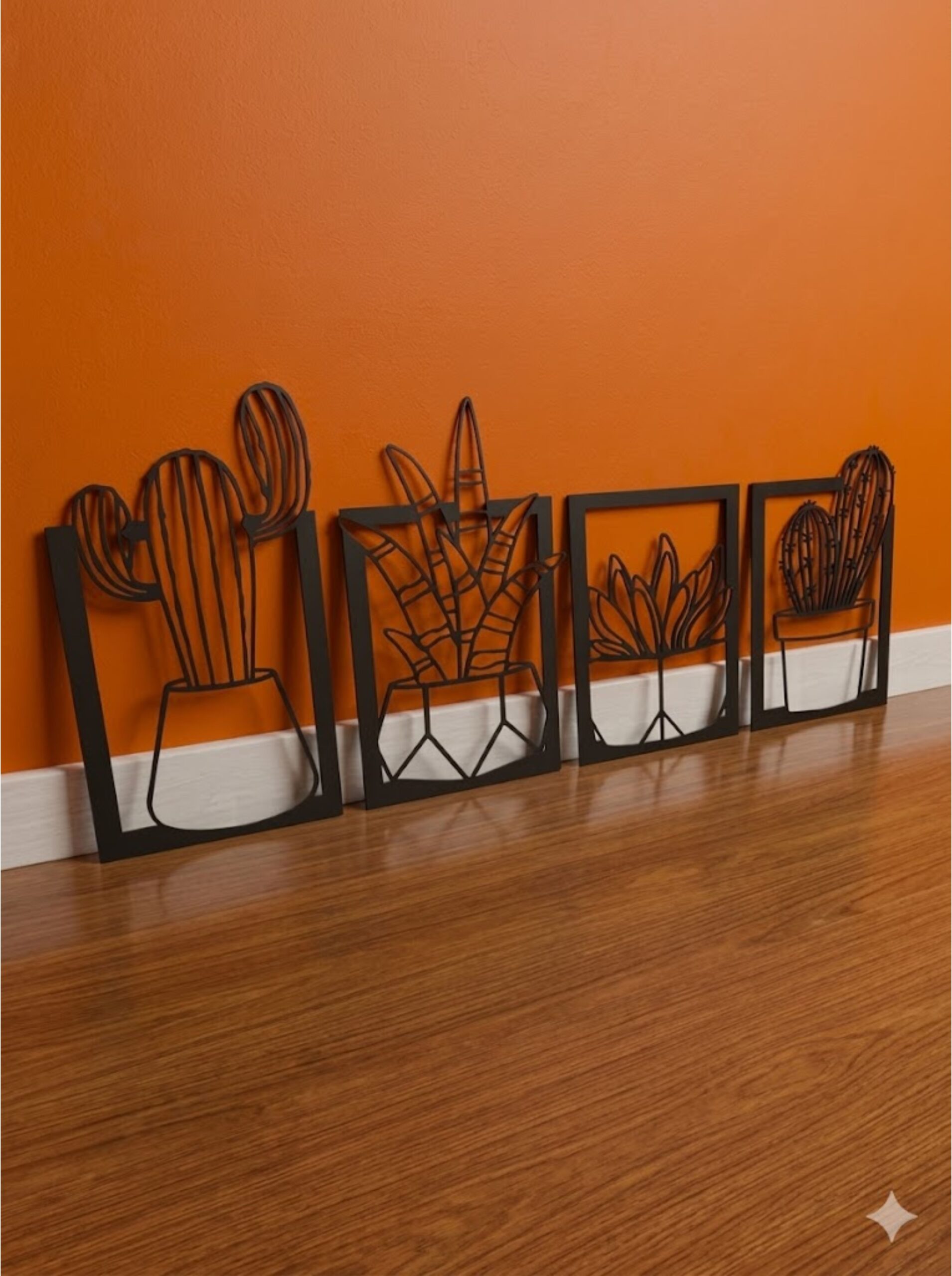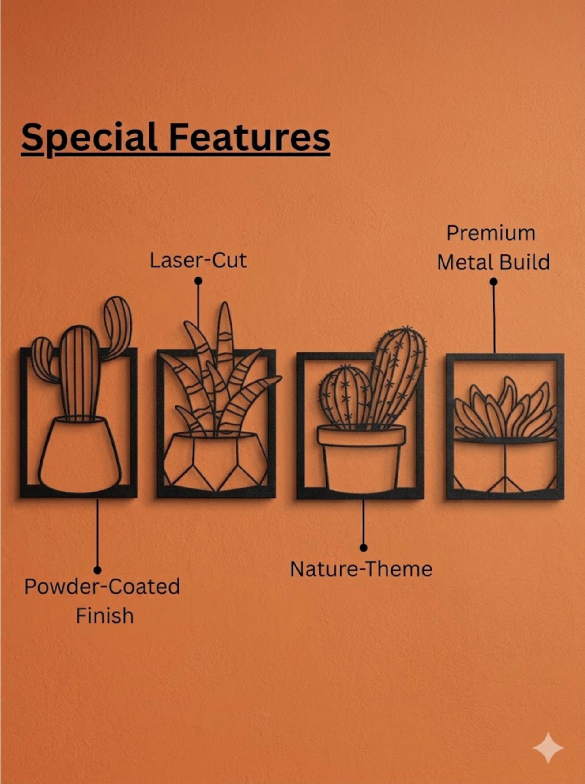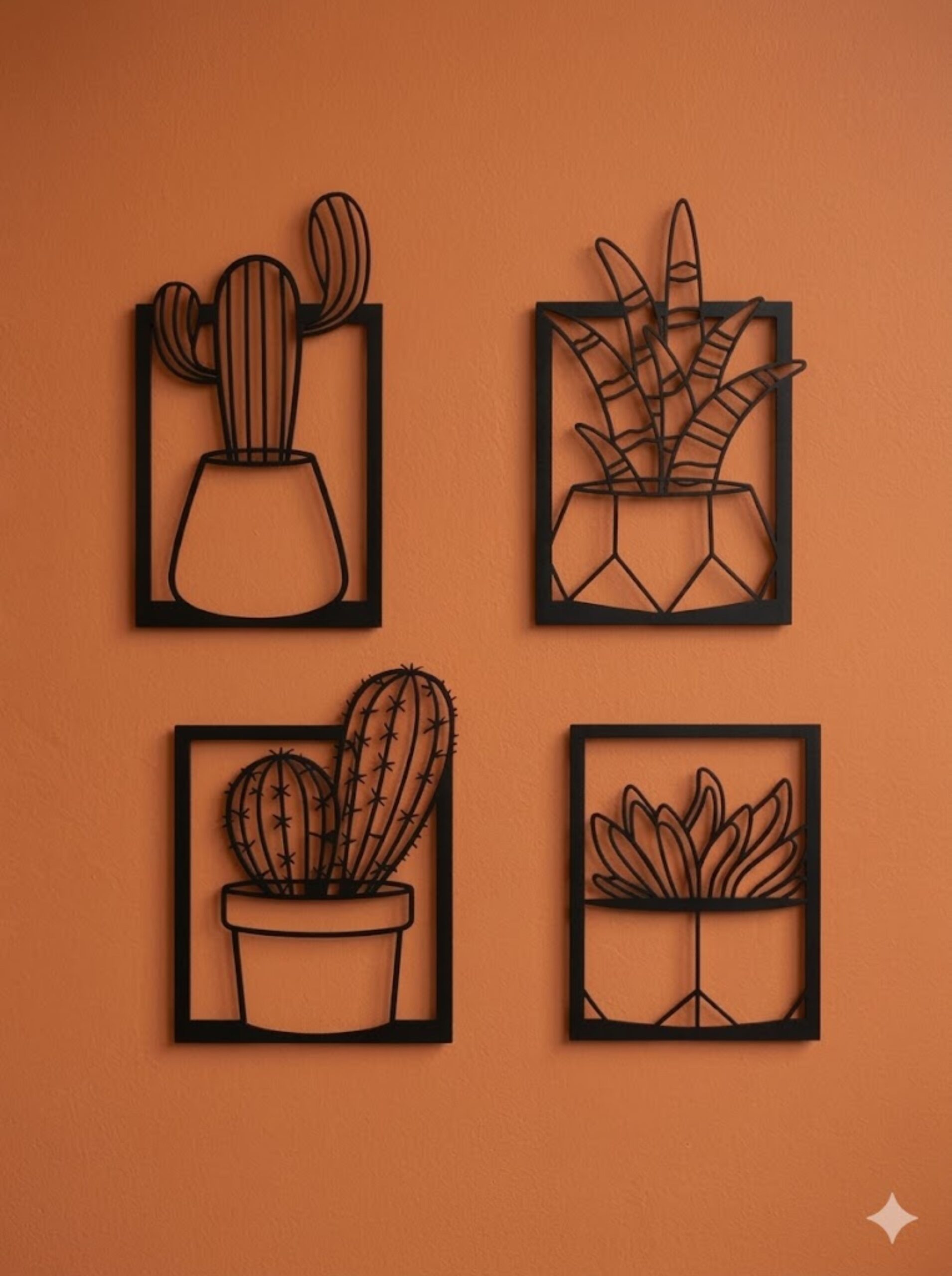 Bring a perfect blend of modern design and natural elegance into your space with this Cactus 4-Panel Metal Wall Art Frame. Expertly crafted from premium-quality metal, each panel features a sleek black matte finish enhanced with a subtle 3D effect, creating striking depth and dynamic shadows that shift beautifully with changing light throughout the day.