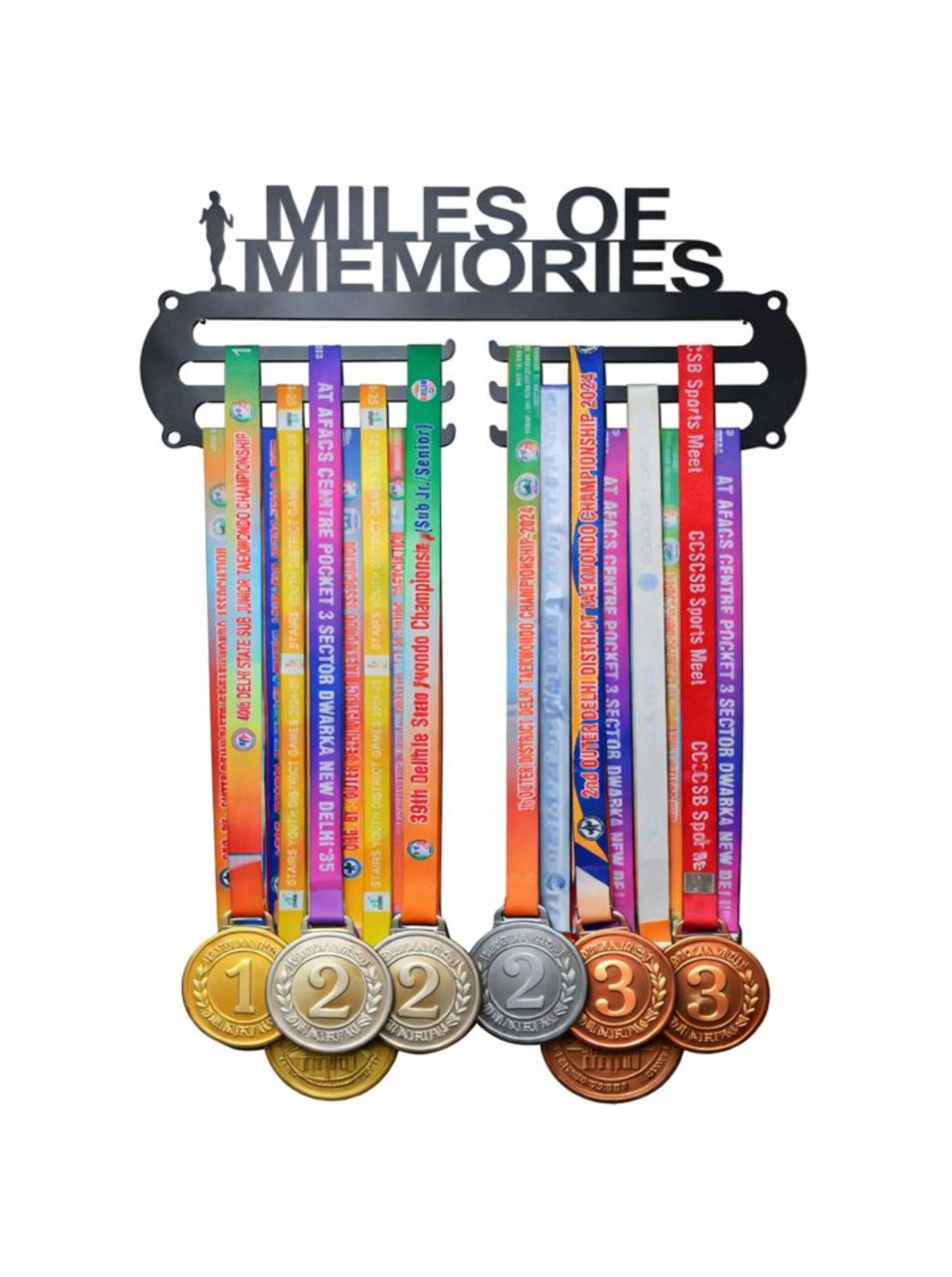 Featuring the bold “Miles of Memories” cut-out text with a runner silhouette, this hanger symbolizes dedication, endurance, and the countless miles that lead to success. Multiple sturdy hooks provide ample space to hang medals neatly, preventing tangles while keeping them proudly visible.