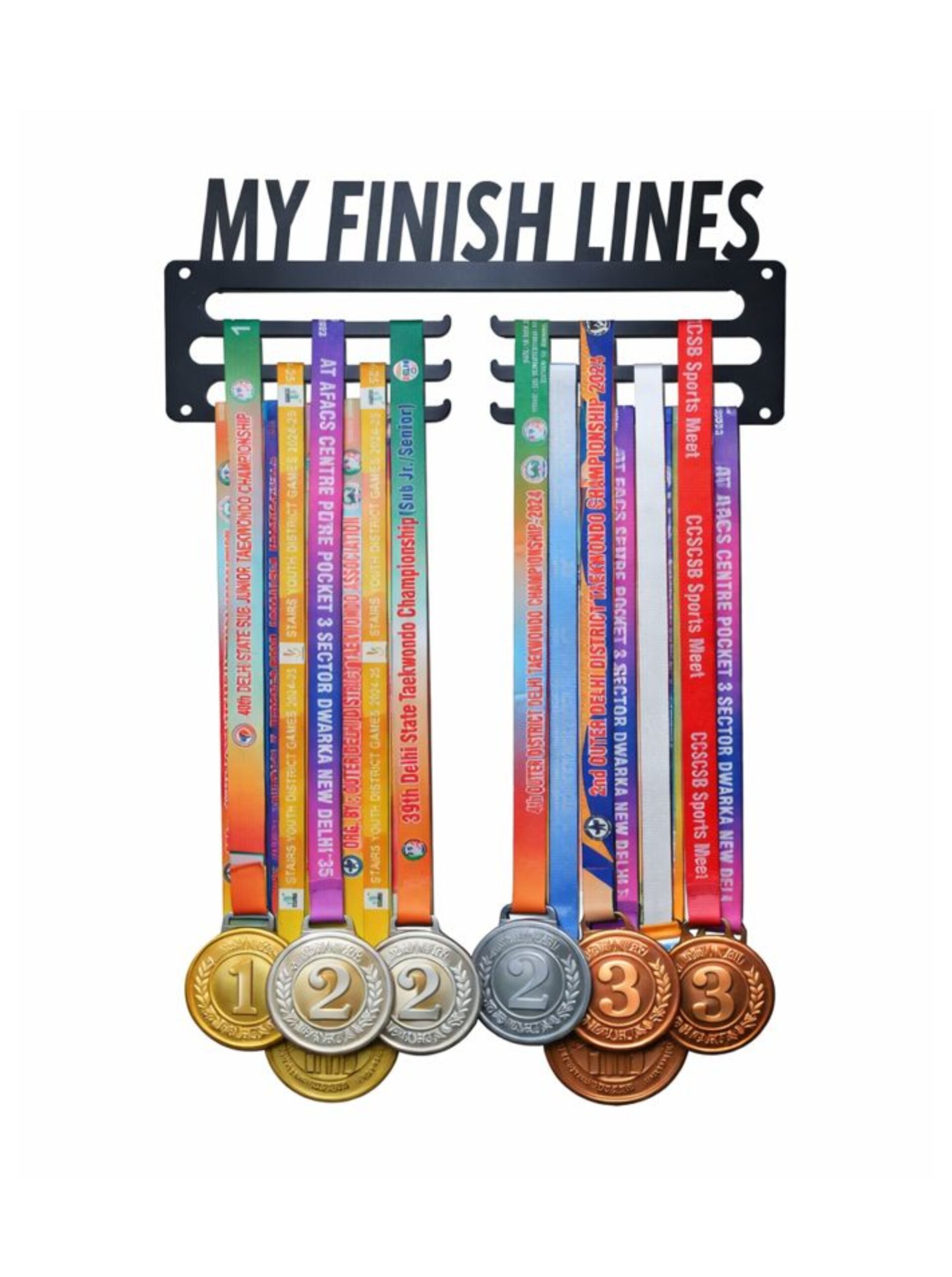 Turn your achievements into inspiration with the My Finish Lines Medal Hanger – Wall-Mounted Metal Display Rack. Designed for athletes and sports enthusiasts, this premium metal hanger allows you to neatly organize and proudly display medals from competitions, championships, marathons, school sports, martial arts, and fitness events.
