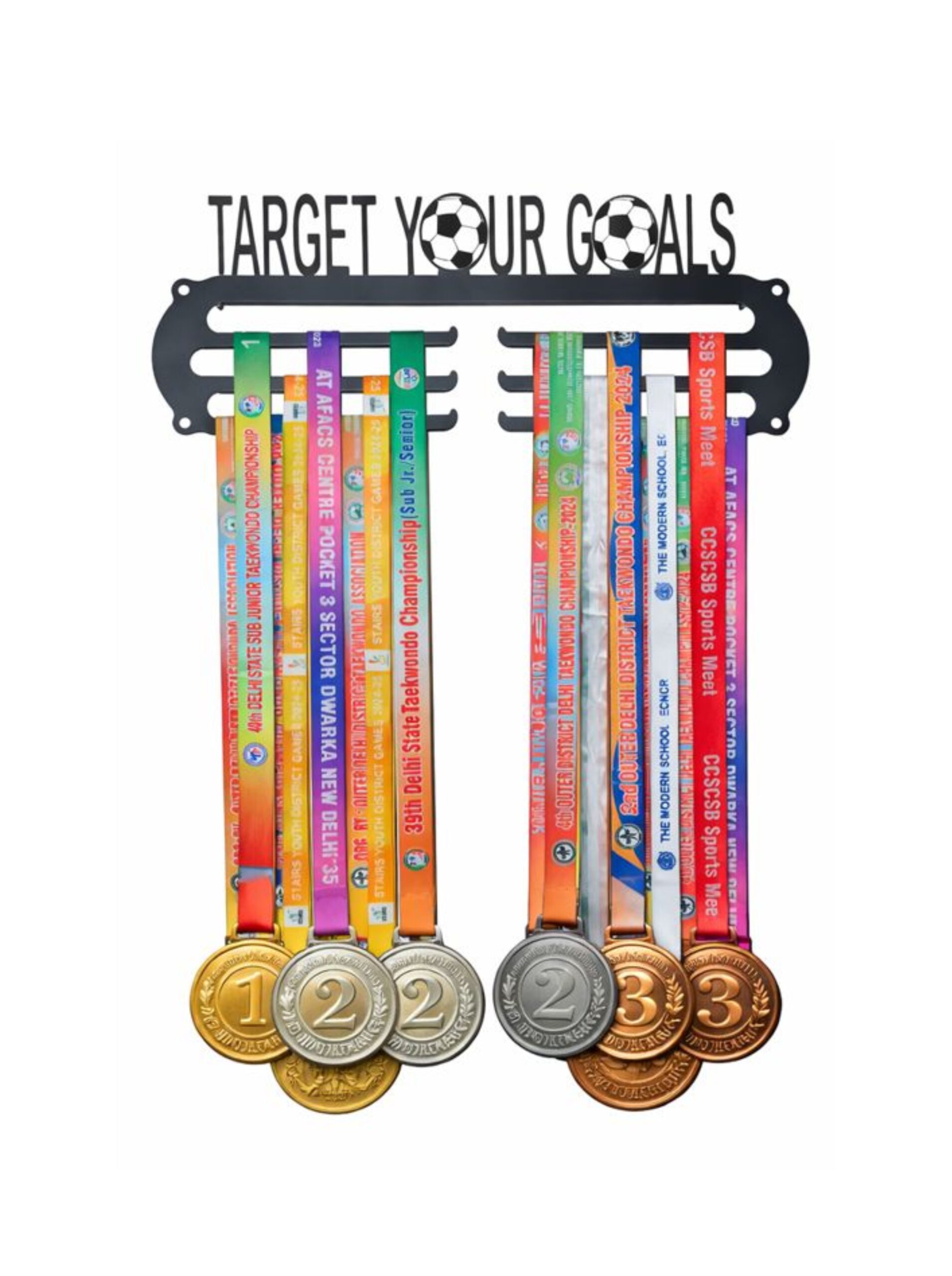 The bold “Target Your Goals” motivational quote, combined with sports-themed cut-out details, adds an inspiring and stylish touch to any bedroom, home gym, sports academy, or training area. The wall-mounted, space-saving design keeps medals organized, tangle-free, and proudly displayed, turning your accomplishments into eye-catching décor.